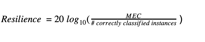 Example: The noise resilience of a machine learner is -6 dB. This is, each instance can add on average one bit of noise before the classification result changes.